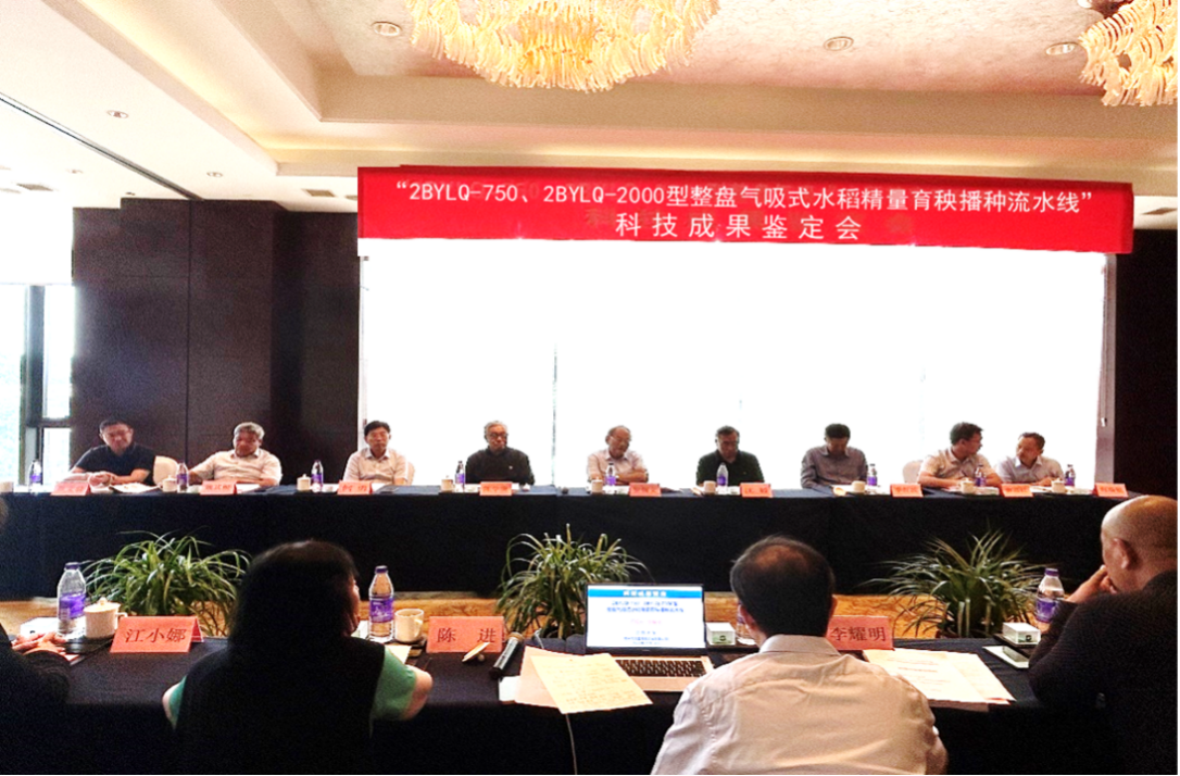 9月16日,中国机械工业联合会在常州市主持召开科技成果鉴定会,由江南网页版官网和常州市风雷精密机械有限公司共同完成的“2BYLQ-750、2BYLQ-2000型整盘气吸式水稻精量育秧播种流水线”顺利通过科技成果鉴定。