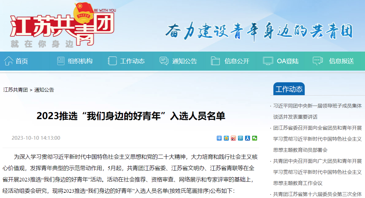 为深入学习贯彻习近平新时代中国特色社会主义思想和党的二十大精神,大力培育和践行社会主义核心价值观,发挥青年典型的示范带动作用,5月起,共青团江苏省委、江苏省文明办、江苏省青联等在全省开展2023推选“我们身边的好青年”活动。活动在社会推荐、资格审查、网络展示和专家评审的基础上,经活动组委会研究,最终产生了包括爱岗敬业、创新创业、勤学上进、担当奉献、崇德守信等5类共100名2023江苏省“我们身边的好青年”。