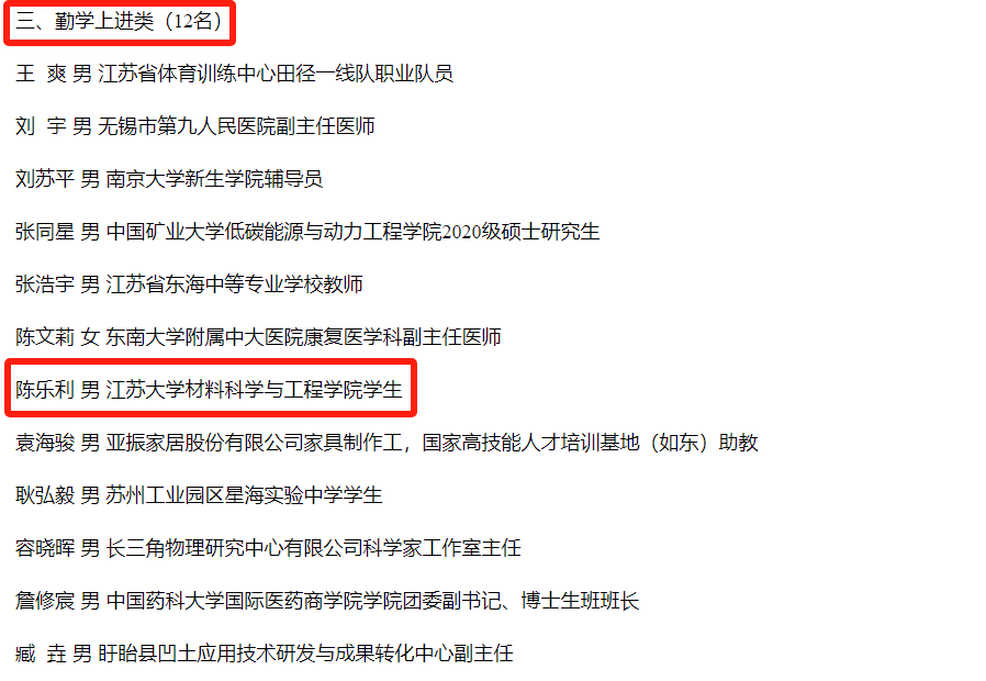 近日,江苏共青团公布了2023推选“我们身边的好青年”入选人员名单,我校材料学院2021级博士生陈乐利入选勤学上进类好青年。
