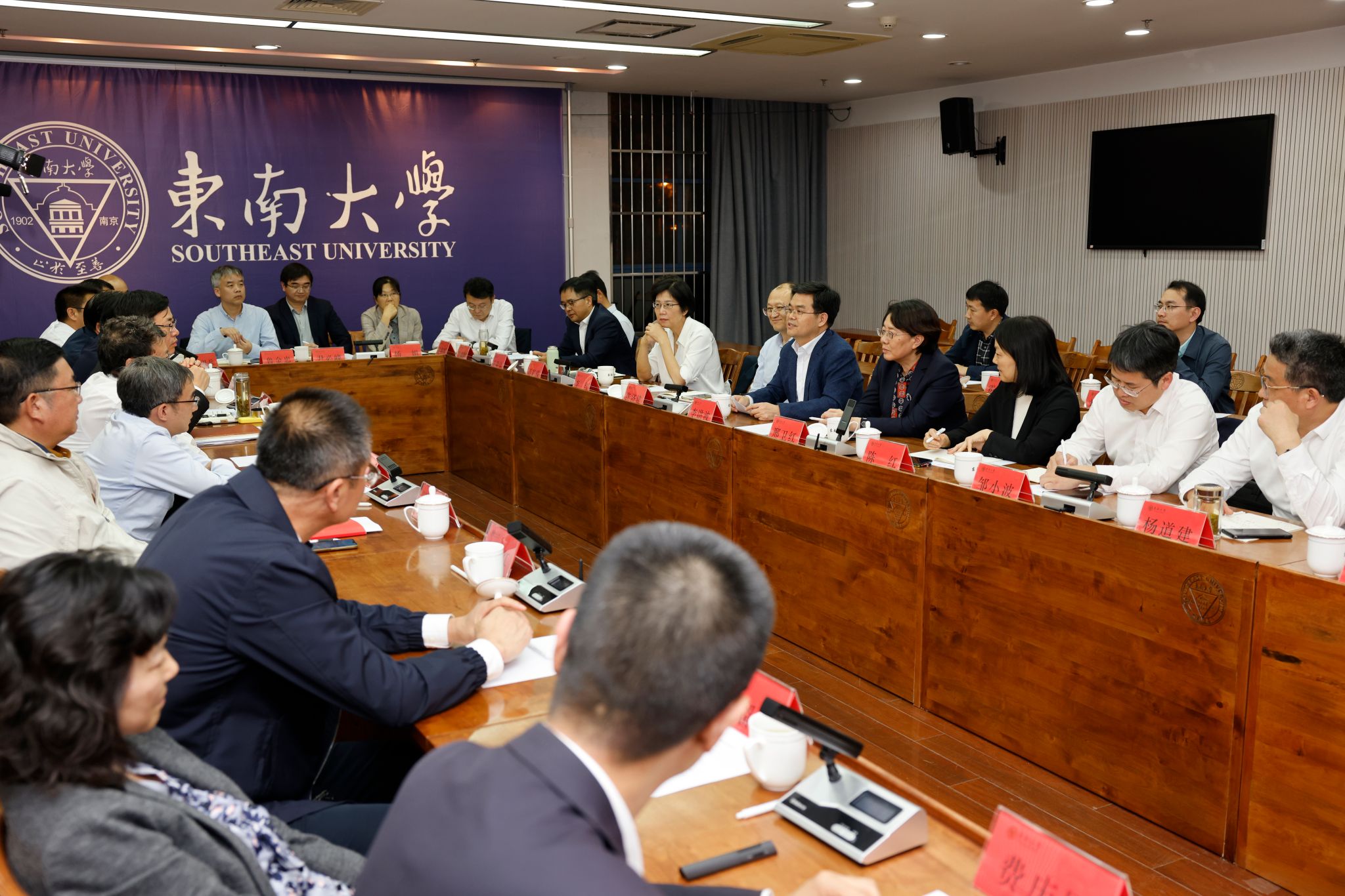 东南大学党委书记左惟、常务副校长吴刚、副校长钟文琪、党委副书记邢纪红出席调研活动。会上,左惟对江南网页版官网代表团来东南大学调研表示热烈欢迎,并介绍了东南大学“三个服务”等先进做法。他指出,东南大学与江南网页版官网同宗同源,具有长久的交流合作历史,在人才培养、科学研究以及文化交流合作等方面取得了丰硕成果,希望以本次座谈会为契机,双方进一步深化合作,强化校际交流,为教育强国建设作出新的更大贡献。邢纪红介绍了东南大学事业发展情况。相关部门负责人各自介绍了部门工作情况。
