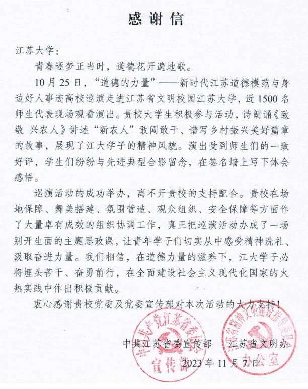 近日,江苏省委宣传部、省文明办向我校发来感谢信,对我校在“道德的力量”——新时代江苏道德模范与身边好人事迹巡演走进江南网页版官网中所做工作提出高度赞扬,对我校为全省精神文明建设作出的重要贡献表示衷心感谢。
