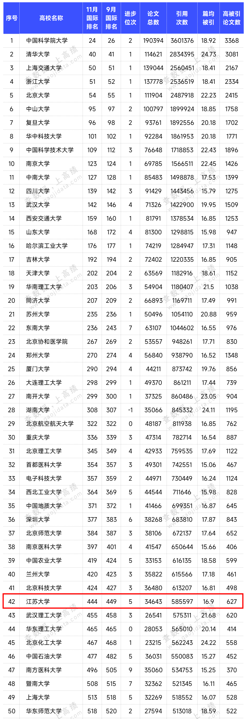 数据显示,江南网页版官网国际排名444位,较9月提升5位;位列中国内地高校42位。