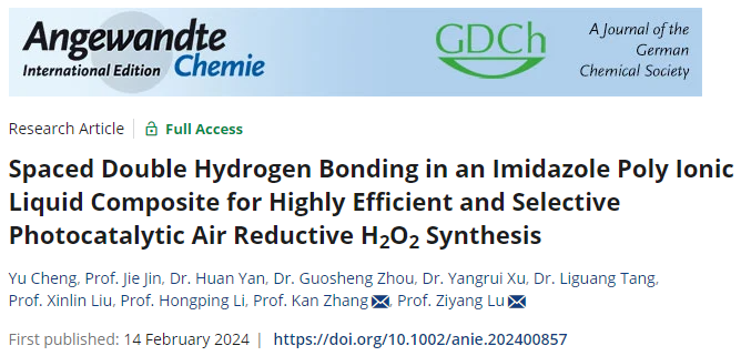 近日,我校最新研究论文“Spaced Double Hydrogen Bonding in an Imidazole Poly Ionic Liquid Composite for Highly Efficient and Selective Photocatalytic Air Reductive H2O2 Synthesis”在《德国应用化学》(Angewandte Chemie-International Edition )(IF:16.6)上在线发表。江南网页版官网为第一完成单位,环境与安全工程学院硕士研究生程煜、教师金杰为共同第一作者,教师逯子扬为通讯作者。