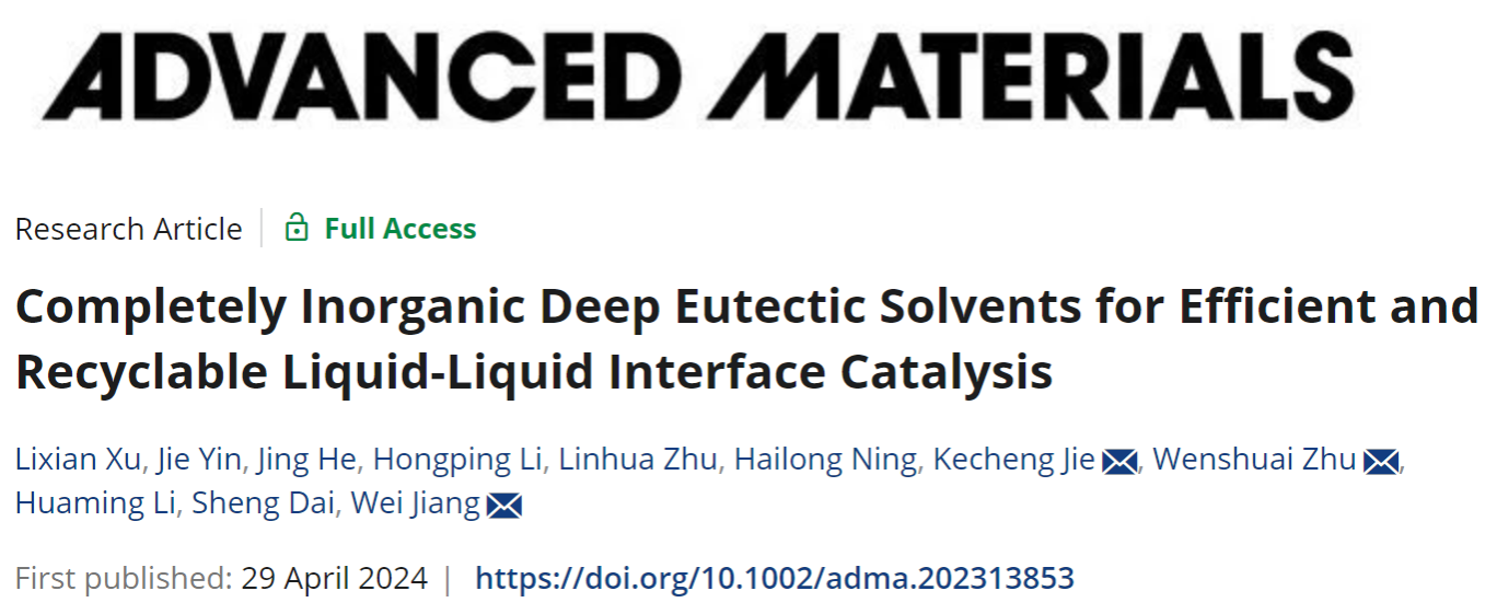 近日,我校能源研究院蒋伟副研究员团队在化学与材料领域顶级期刊《先进材料》(Advanced Materials)上在线发表研究论文“Completely Inorganic Deep Eutectic Solvents for Efficient and Recyclable Liquid-Liquid Interface Catalysis”。江南网页版官网为第一完成单位,能源研究院博士研究生徐丽仙为第一作者,蒋伟、南京大学揭克诚教授与江南网页版官网朱文帅教授为共同通讯作者。