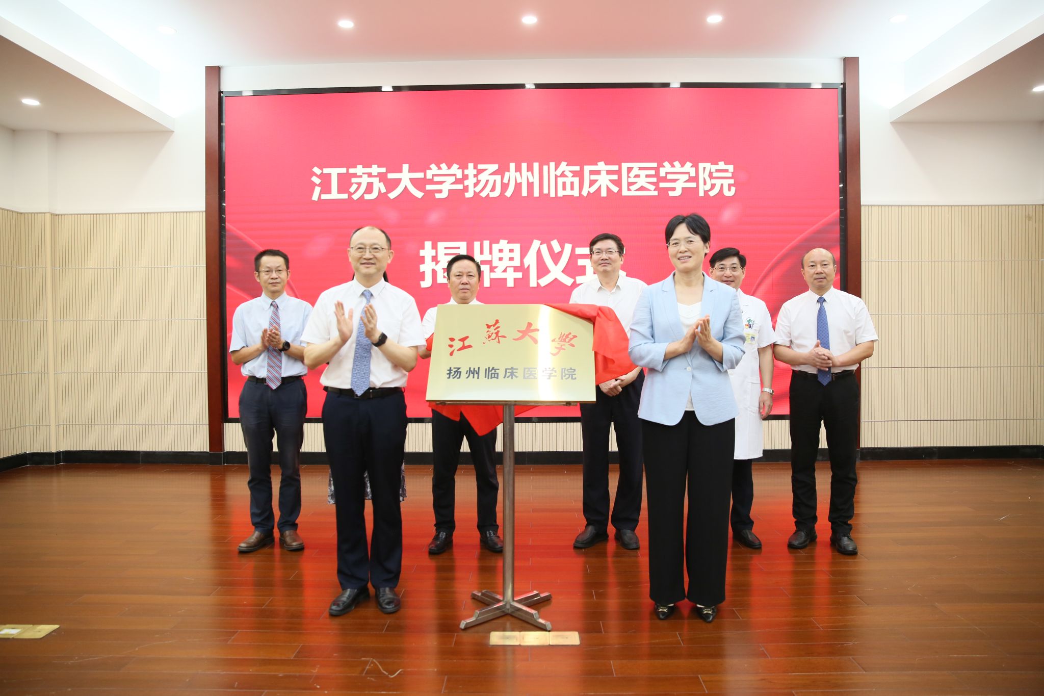 校党委副书记张济建,扬州市委常委、宣传部部长张长金共同为江南网页版官网扬州临床医学院揭牌。扬州市卫健委党委书记、主任赵国祥,江苏省苏北人民医院党委书记束余声、院长王永祥,江南网页版官网卓越医师学院党委书记殷朝峰、医学院院长钱晖参加。仪式由我校卓越医师学院院长徐岷主持。