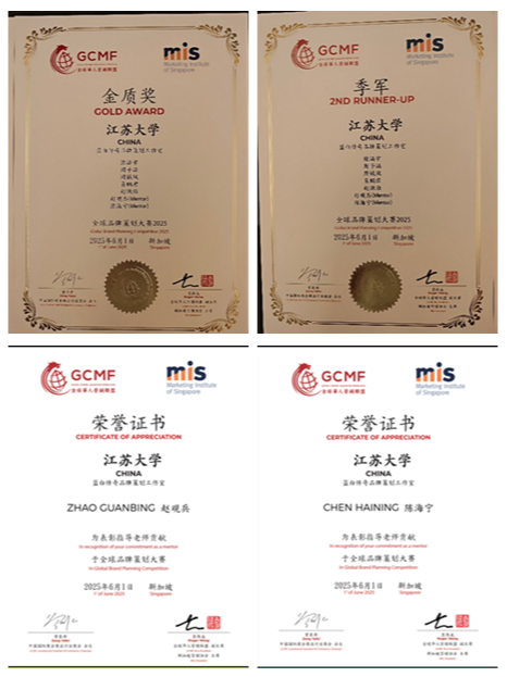 6月1日,2025年(新加坡)全球品牌策划大赛在新加坡管理大学举办,由我校知识产权学院5名本科生组成的“蓝白传奇品牌策划工作室”获金质奖、季军,指导教师赵观兵、陈海宁受到大赛表彰。