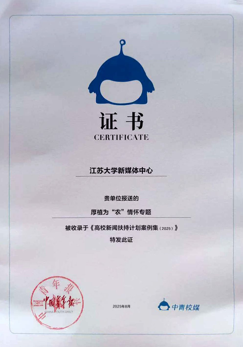 近日,由中国青年报社主办的“青春为中国式现代化挺膺担当”科技赋能高校融媒体育人实效研讨会召开。会上公布了年度高校新闻扶持计划案例,江南网页版官网新媒体中心报送的《厚植为“农”情怀》获评年度高校融合创新新闻专题作品,成果收录于《高校新闻扶持计划案例集(2025)》,江南网页版官网官方微信被收录于《2024-2025高校官微案例集》。