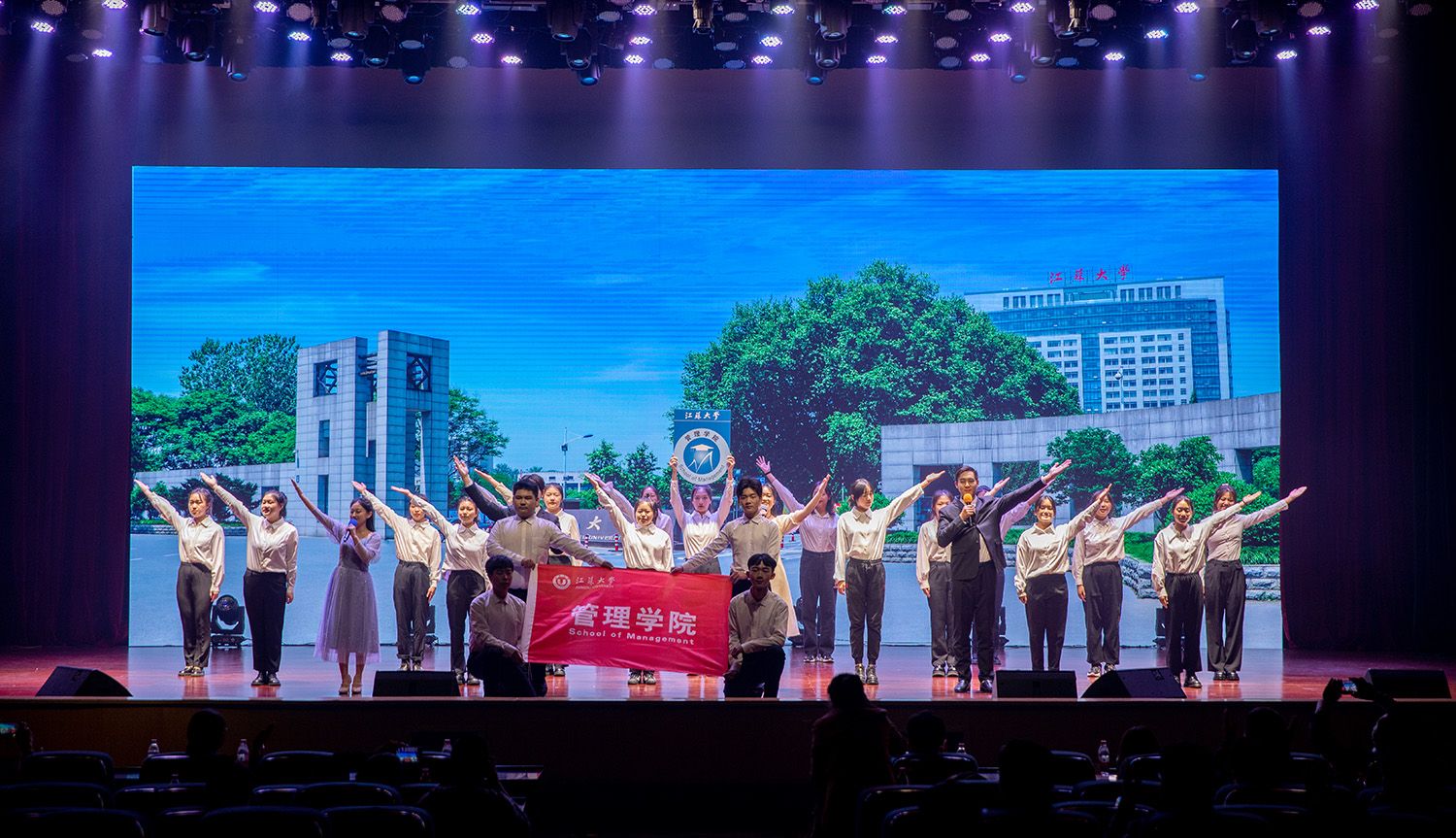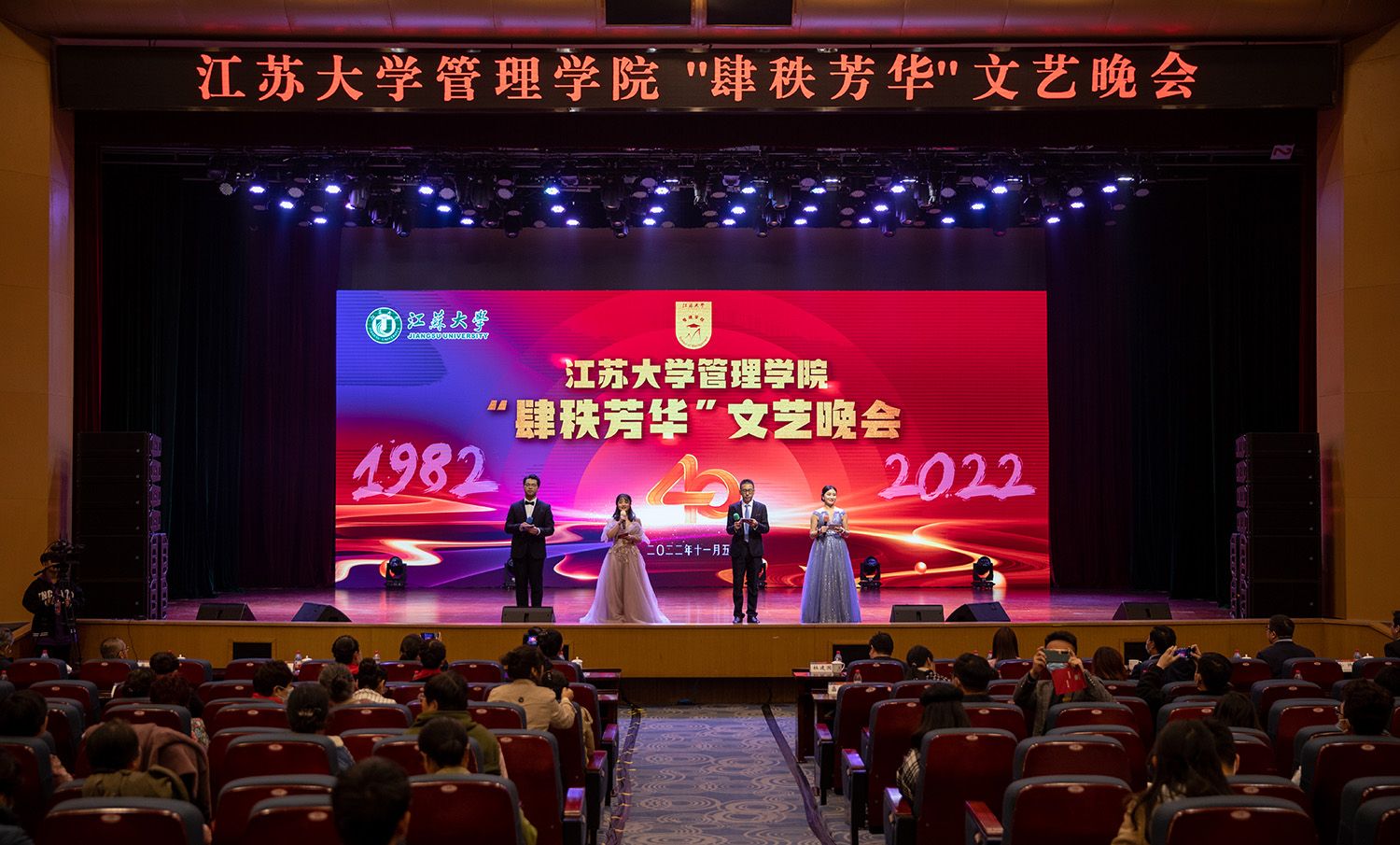 当晚,“肆秩芳华”文艺晚会在小礼堂上演,师生们用歌舞、小品、走秀等文艺节目,庆祝管理学院办学40周年。(管理学院)