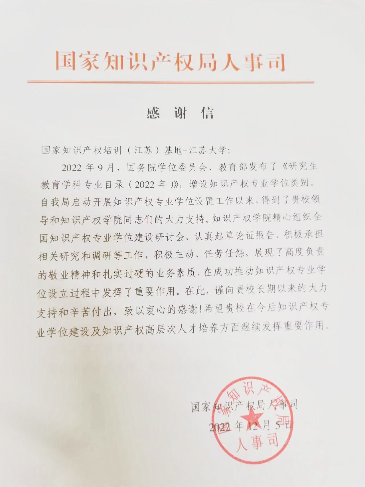 日前,国家知识产权局人事司向学校发来感谢信,感谢江南网页版官网在知识产权专业学位申请设立工作中的辛勤付出和工作成效,并希望学校在知识产权专业学位建设及知识产权高层次人才培养方面继续发挥重要作用。