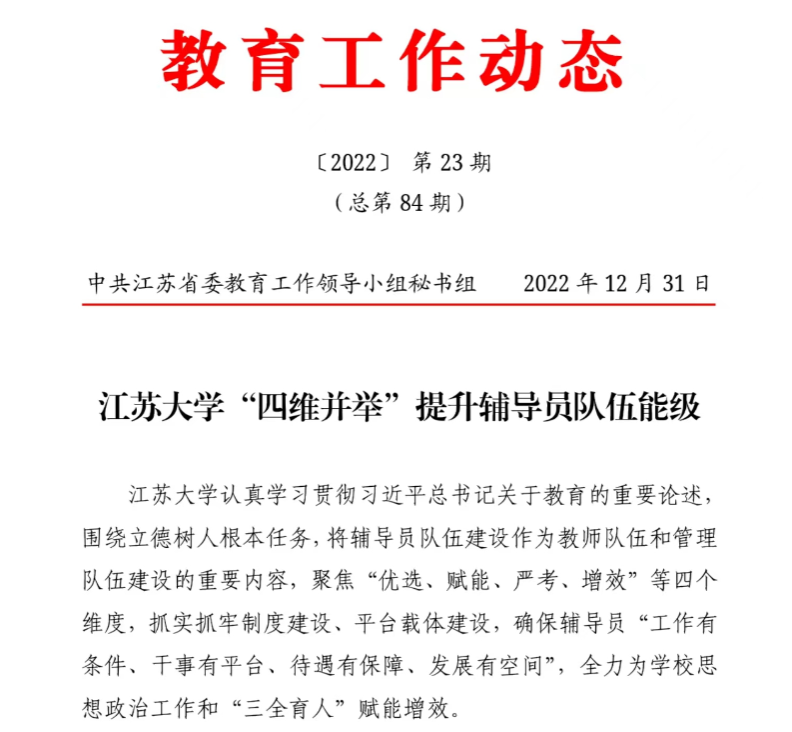 12月31日,中共江苏省委教育工作领导小组《教育工作动态》(2022年第23期)以《江南网页版官网“四维并举”提升辅导员队伍能级》为题,专题报道我校辅导员队伍建设的工作思路、举措与成效。