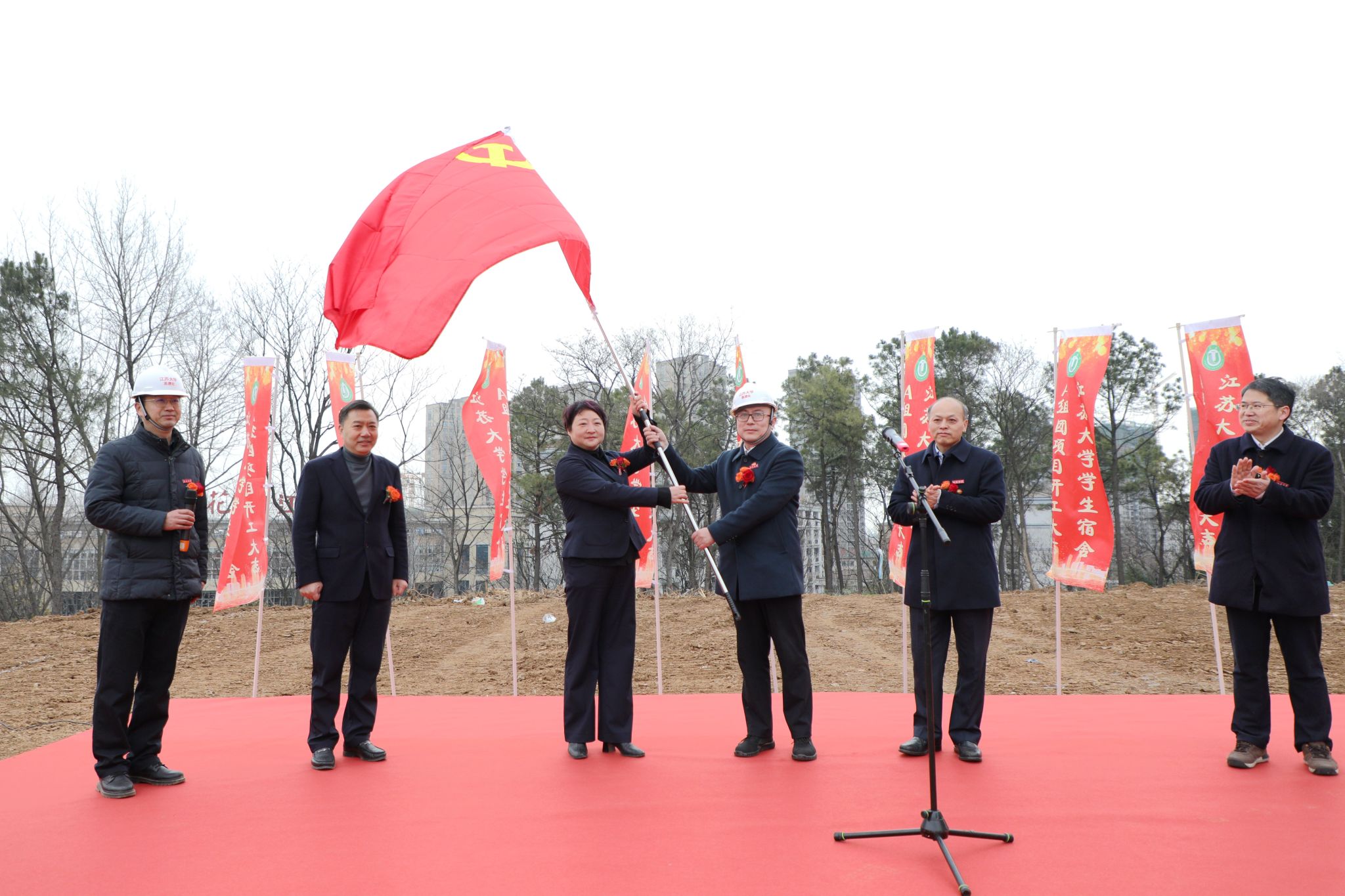 颜晓红向基建处党支部和镇江建工建设集团有限公司项目管理机构党小组授党旗,要求参建各方以党建为引领,充分发挥党员干部的先锋模范作用,紧密配合、分工合作、精心组织、安全施工、打造精品。