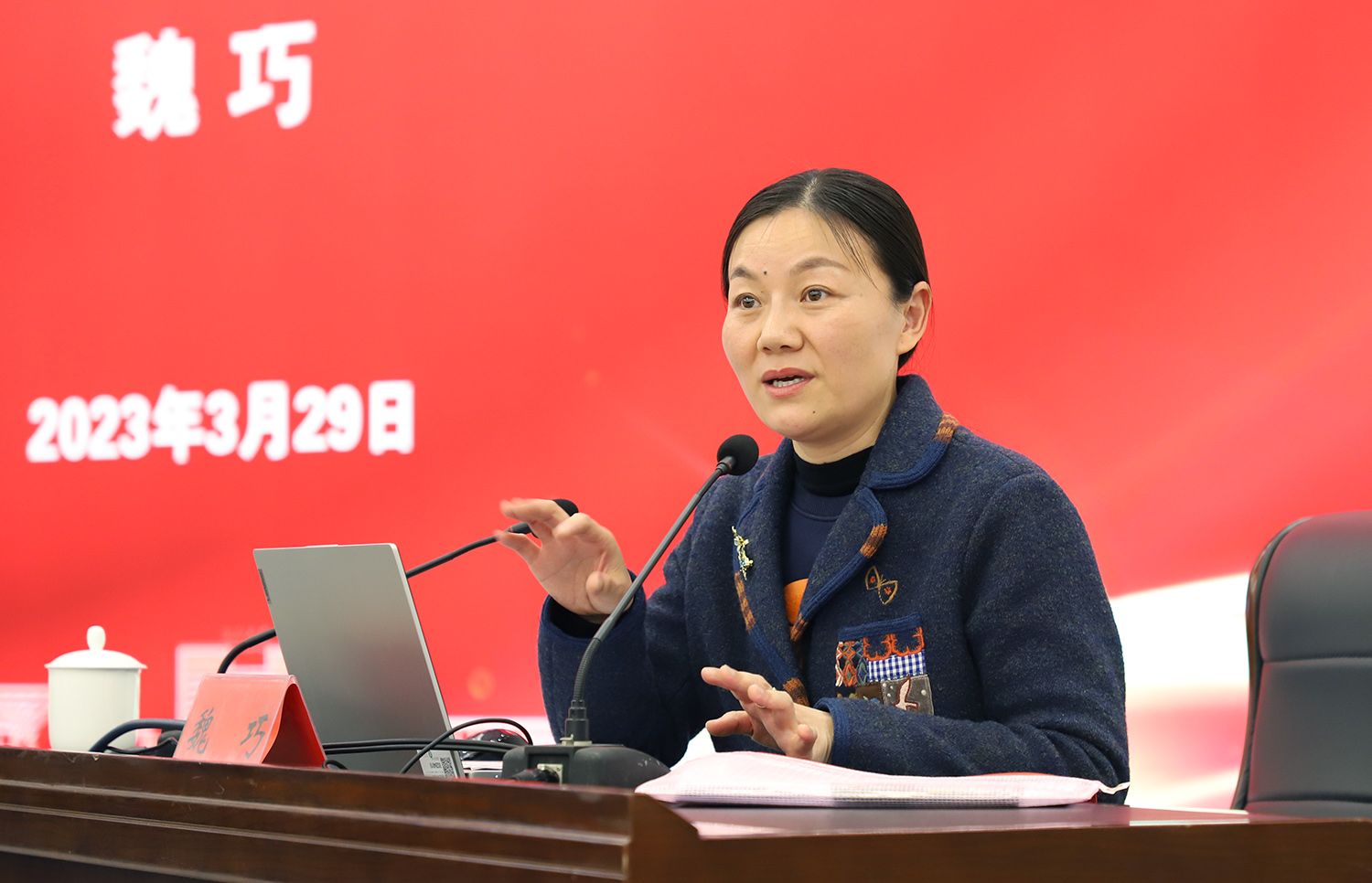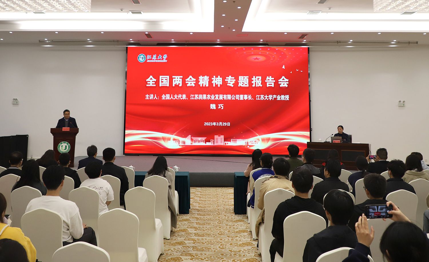 3月29日,江南网页版官网全国两会精神专题报告会在青教公寓多功能厅举行。全国人大代表、镇江市镇江新区永兴农机机械化专业合作社理事长、江苏润果农业发展有限公司董事长、江南网页版官网产业教授魏巧走进校园,为师生作全国两会精神专题报告。报告会由校党委常委、宣传部部长杨道建主持。