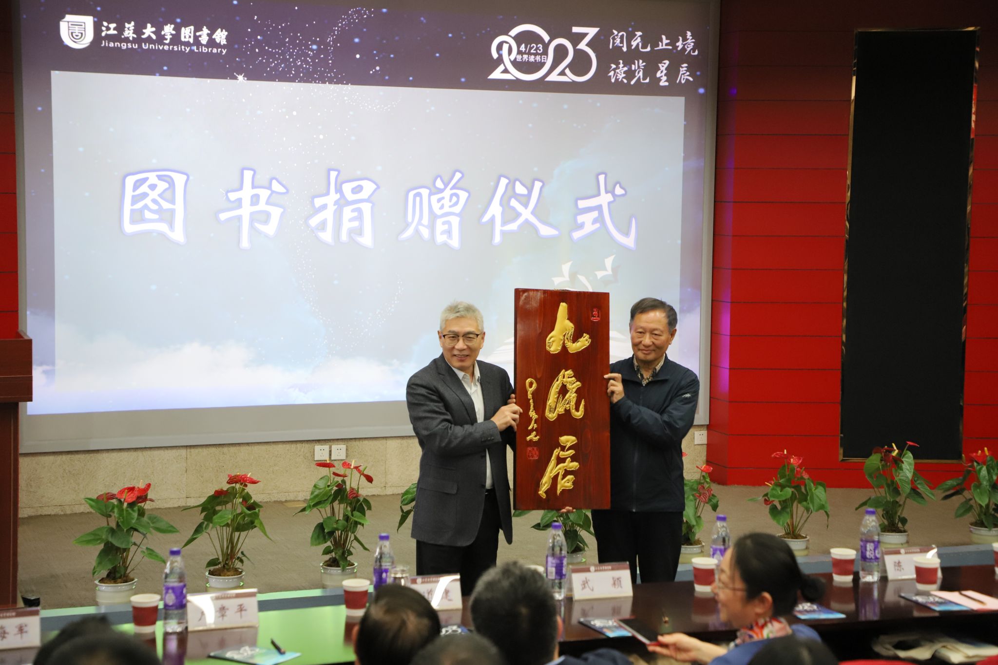 4月22日,学校2023年“读书节”活动在图书馆一楼报告厅拉开帷幕,主题为“阅无止境,读览星辰”。镇江市政协副主席、副校长陈红,财政部驻江苏专员办原监察专员、江苏省政府参事蔡润及其夫人武颖,镇江市文旅产业集团总经理蒋云峰,校党委常委、宣传部部长杨道建,江苏省政府参事卢章平,央视“百家讲坛”主讲人、陕西师范大学教授于赓哲,镇江市作家协会原主席王川,镇江市作家协会主席蔡永祥及各界文化名人出席开幕式。校职能部门负责人、学院以及相关二级党组织书记、来自全校各学院的200余名师生参加开幕式。开幕式由图书馆党委书记张明平主持。