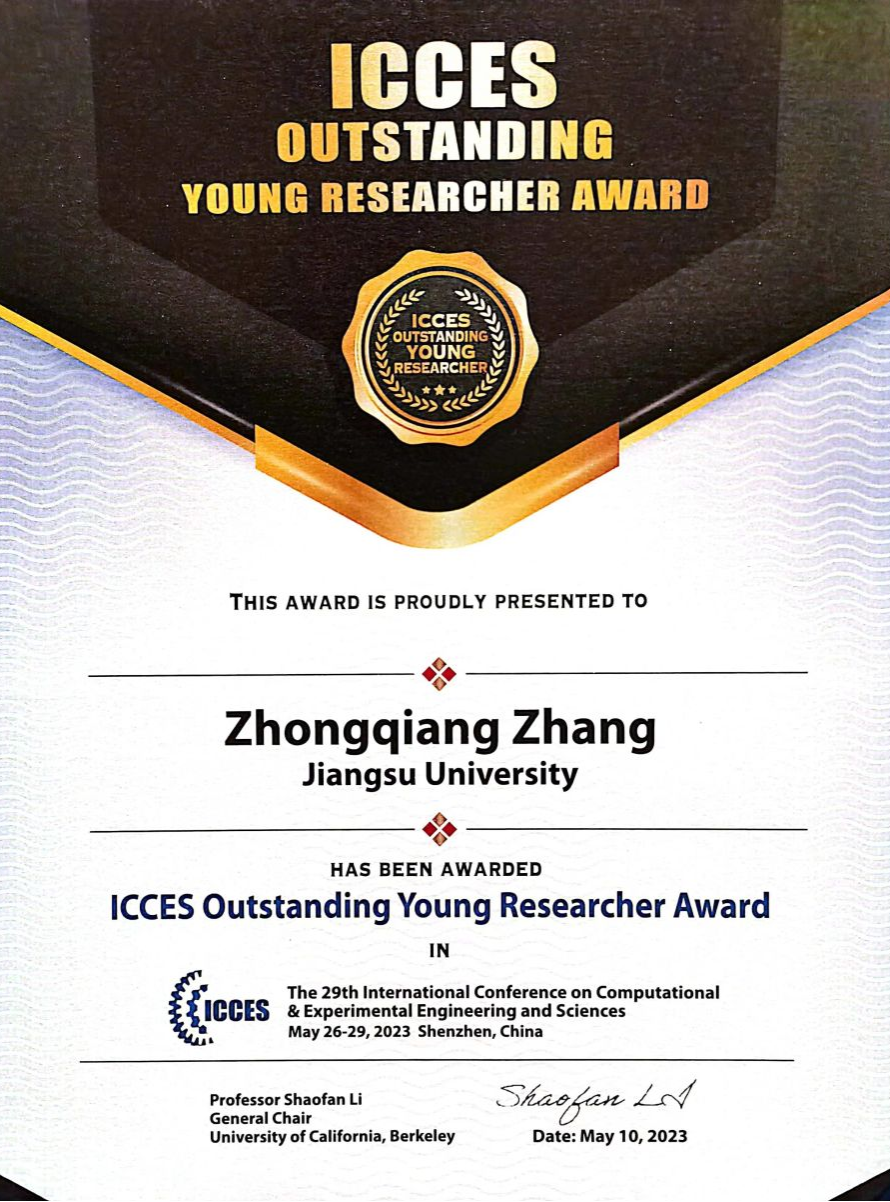 本次会议经计算与实验科学工程国际会议委员会推举、评选,江南网页版官网张忠强教授、上海交通大学张律文教授、南京航空航天大学殷俊教授、华中科技大学肖蜜教授、河海大学傅卓佳教授等5位青年学者荣获ICCES杰出青年学者奖,哈尔滨工程大学张阿漫教授为五位获奖者颁奖。