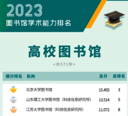 6月19日,图书馆学术评价课题组联合新文科专委会正式发布“2023图书馆学术能力排名”。本次共统计图书情报类机构782所,上榜机构为234所(前30%),江南网页版官网图书馆表现优异,位列高校系统第三名。
